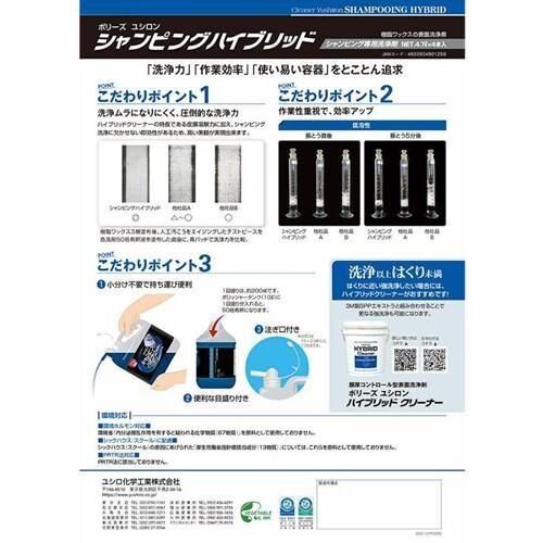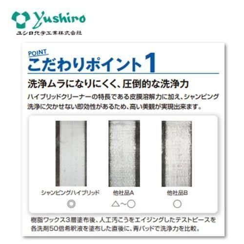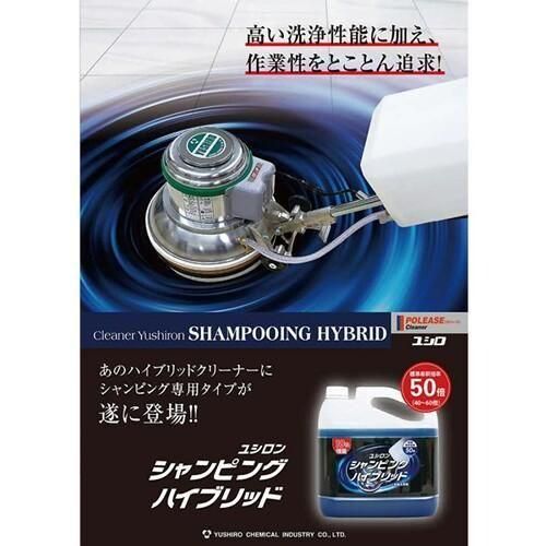 ■JANコード:4933934901258■型番:3120009931■メーカー:ユシロ■商品名:シャンピングハイブリッド■容量:4.7L■入数:1本、4本セット■主成分:非公開■Ph:13■標準希釈倍率:50倍(40-60倍希釈使用)■標準使用量:200cc/平米