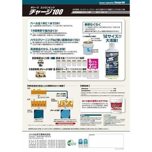 ■JANコード:4933934900725■品番:3130001021■メーカー:ユシロ化学工業株式会社■商品名:ユシロピック チャージ100■容量:18L■主成分:非公開■Ph:12(10倍希釈液)■標準希釈倍率:15倍(12倍-30倍希釈まで可能)