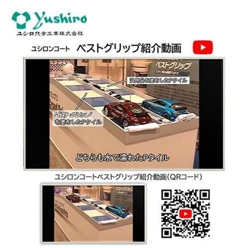 スリップ防止樹脂ワックス、ユシロンコートベストグリップは水に濡れた床でも足元安全!脅威のグリップ力を発揮。撥水効果の高い新開発特殊ポリマーの働きで被膜上に水が存在する箇所を最小限に抑えるため濡れた状態においてもつ通常時と同様のスリップも少ない歩行感が持続