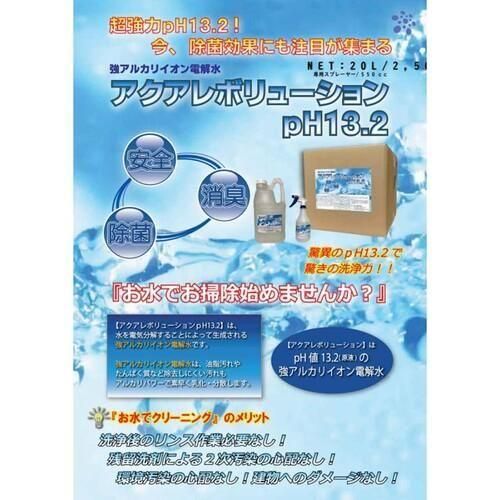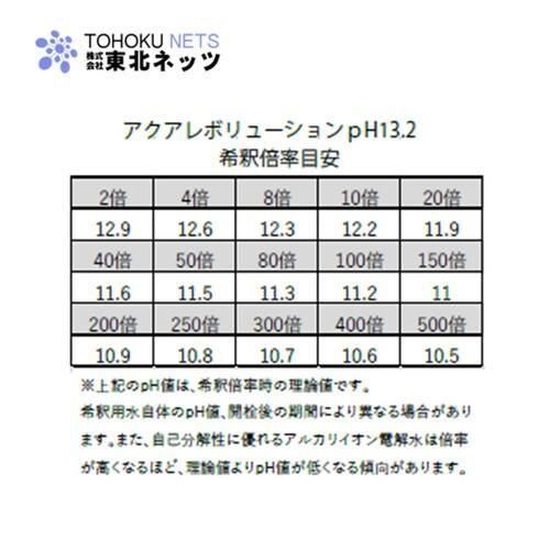 ■発売元:東北ネッツ■商品名:アルカリ電解水アクアレボリューションPh13.2■容量:20L、2500ml■主成分:純水、カリウムイオン ■Ph:13.2■標準希釈倍率:原液-500倍(超高濃度)