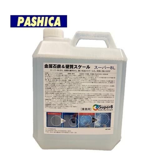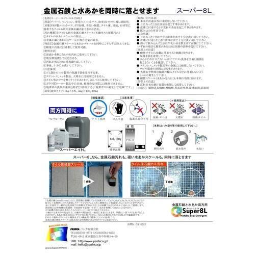 ■メーカー:パシカ有限会社■商品名:スーパーエイト・エル(S8L)■重量:4Kg■成分:植物系有機酸、無機酸、界面活性剤、浸透助剤、添加剤■Ph:2以下(25℃)■液体の色:無色透明液体■標準希釈倍率:原液-10倍■標準使用量:約100g/平米