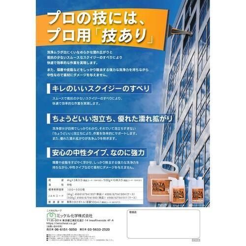 ■JAN:4986167941997■品番:194190■メーカー:ミッケル化学■商品名:ウィンドウクリーナー技あり■容量:4kg■ポリ(オキシエチレン)=アルキルエーテル、金属イオン封鎖剤、水■Ph:6.00-8.00(中性)■標準希釈倍率:100-500倍