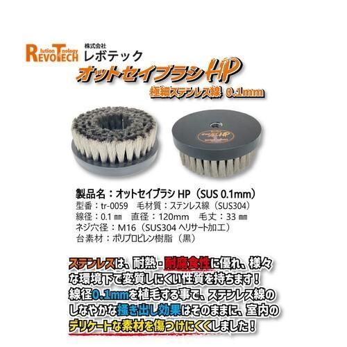 ■JANコード:4573155420215■品番:tr-0059■メーカー:株式会社レボテック■商品名:オットセイブラシHP(SUS0.1mm)■毛材質:ステンレス線(SUS304)■線径:0.1mm■直径:120mm■毛丈:33mm■ネジ穴径:M16(SUS304 ヘリサート加工)■台素材:ポリプロピレン樹脂(黒)