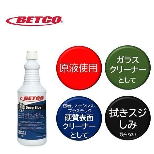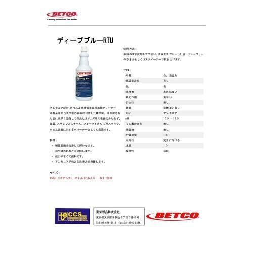 ■品番:BET10812■メーカー:BETCO(ベトコ)■商品名:ディープブルーRTU■容量:950ml■主成分:エチレングリコールモノ−ノルマル−ブチルエーテル、4−ジオキサン、水酸化ナトリウム■Ph:10-11.4(アルカリ性)■標準希釈倍率:原液