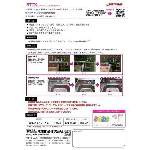 ■JANコード:700427076120■品番:BET07612 ■メーカー:ベトコ■輸入元:東栄部品株式会社■商品名:スティックス■容量:950ml■成分:リン酸■Ph:1.5-2.5■標準希釈倍率:原液使用