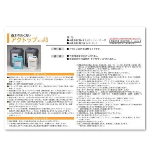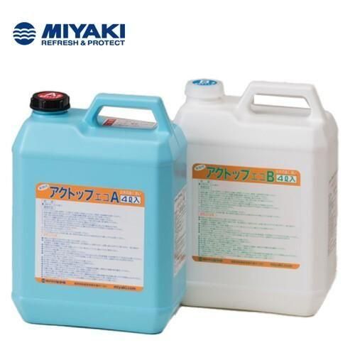 ■メーカー:株式会社ミヤキ■商品名:アクトップエコAB■容量:A/4L×1本・B/4L×1本■入数:1セット■主成分:アクトップA/過酸化水素、安定剤、水・アクトップB/水酸化ナトリウム、漂白助剤、界面活性剤、相溶化剤、水■Ph:中性■標準希釈倍率:(A液)1:(B液)1■標準使用量:5-10平米/L