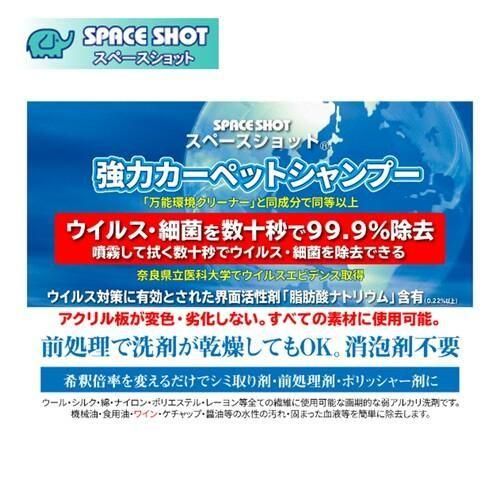 ■JANコード:4524569512034■メーカー:オーブテック■商品名:スペースショット強力カーペットシャンプー■容量:1L■成分:界面活性剤、石けん成分=脂肪酸ナトリウム、トウモロコシ油、ココナッツ油、脂肪酸ココメチルエステル他■Ph: 10.7(弱アルカリ性)■標準希釈倍率:原液-1000倍希釈