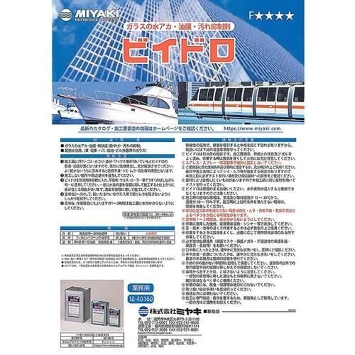 ■メーカー:株式会社ミヤキ■商品名:ビイドロ■容量:16L■主成分:フッ素シリコーン化合物、無機酸、イソプロピルアルコール■Ph:データなし(非水溶)■標準希釈倍率:原液■標準使用量:50-60平米/L(1回塗り)