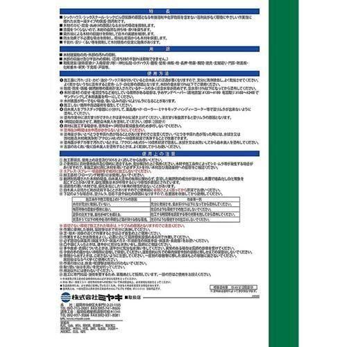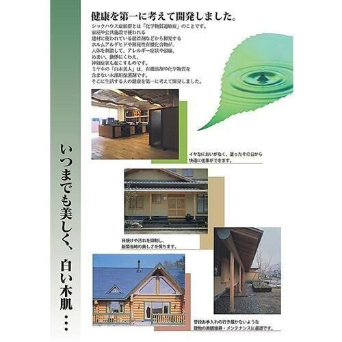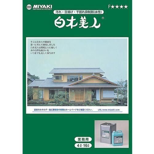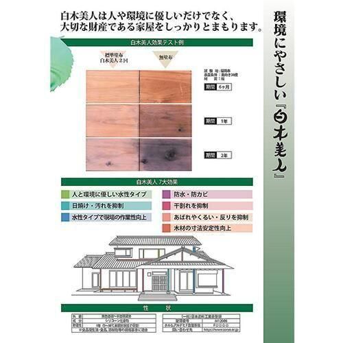 ■メーカー:株式会社ミヤキ■商品名:白木美人■容量:4L■主成分:シリコーン化合物、寸法安定剤 、防カビ剤、紫外線吸収剤、光安定剤、界面活性剤、水■Ph:5-7■標準希釈倍率:原液■標準使用量:15平米/L(2回塗り)