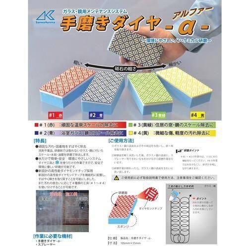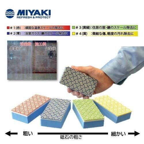 ■メーカー:株式会社ミヤキ■商品名:手磨きダイヤα■種類:♯2・青(ハードタイプ)■用途:浴室ガラス・鏡のスケール除去等用■サイズ:105×55mm
