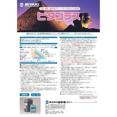 ■メーカー:株式会社ミヤキ■商品名:ピタゴラス■容量:18L■主成分:無機酸、無機塩 、ブチルセロソルブ、増粘剤 、相溶化剤 、水■Ph:2.0±0.5■標準希釈倍率:原液-5倍■標準使用量:7-10平米/L