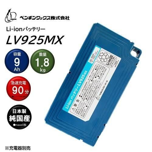 ■品番:009008■メーカー:ペンギンワックス株式会社■商品名:Li-ionバッテリーパックLV925MX■バッテリー容量:9Ah■バッテリータイプ:リチウムイオンバッテリー■バッテリー電圧:DC25.9V■重量:1.8Kg