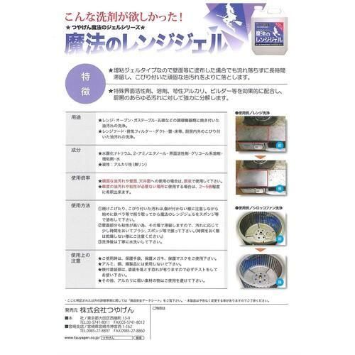 ■製造元:つやげん(TSUYAGEN)■商品名:魔法のレンジジェル■容量:4L(ポリボトル)■主成分:ジエチレングリコールモノブチルエーテル、2-アミノエタノール、水酸化エタノール、陰イオン界面活性剤、非イオン界面活性剤、増粘剤、水■Ph:13〜14(25℃)■標準希釈倍率:原液-5倍