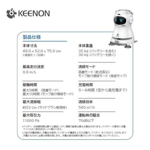 ■型番:C-30■メーカー:KEENON(キーオン)■商品名:自動清掃ロボットC-30■本体寸法:49.0x52.0 x75.0 cm(背面モップを除く)■最高走行速度:0.8m/s■稼働時間:最大5時間 (吸塵モード)・最大10時間 (モップ掛け掃除モード)■最大清掃幅:約53cm (サイドブラシ使用時)■最大吸引力:11000 Pa■本体重量:35kg (バッテリーを含む)・30kg(バッテリーを除く)■清掃モード:吸塵モード (乾式吸引)・モップ掛け掃除モード (背面モップ)■充電時間:5-6時間 (空から満充電まで)■清掃効率:540m2/h■運転時の騒音:70dB以下