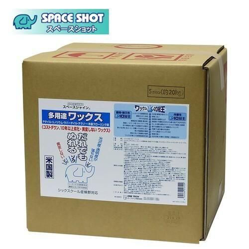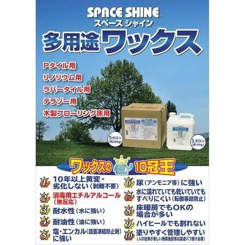■JANコード:4524569513109■メーカー:オーブテック■商品名:スペースシャイン多用途ワックス■容量:5ガロン(18.9L)■成分:アクリル、ポリエチレン、ビニール共重合体、亜鉛、その他■Ph: 8-9(弱アルカリ性)■標準使用量:1800平米/18.9L